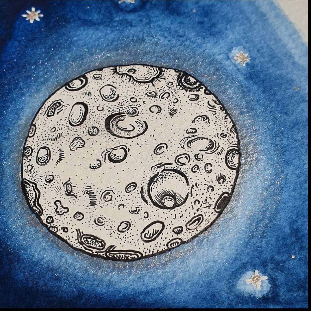 Details of the moon from my recent commission of promo artwork for a socially distanced outdoors poetry event in Eastbourne 🥰 I’ve LOVED working on this piece 💙 Thank you so much @missxarstyxfartsy for trusting me with your creative vision, I hope I did it justice!